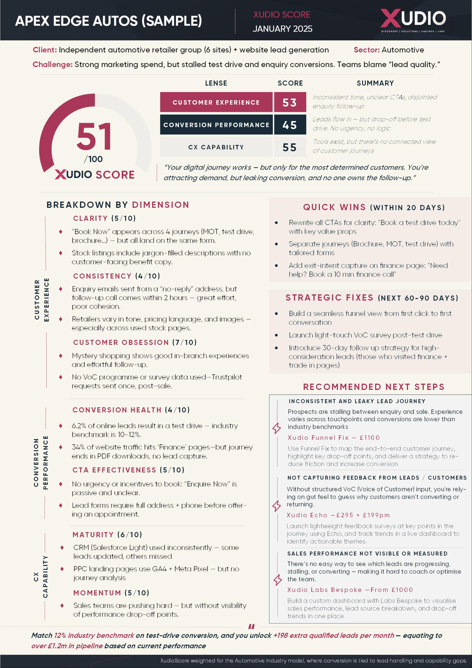 Every Xudio Score includes a PDF like this — tailored to your brand, your funnel, and your commercial levers.